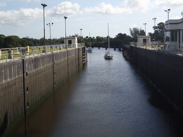 It was a pleasant motor down the canal. This trip to Indiantown really isn’t such a big deal, except for the big concrete thing in the river about half way there. The St. Lucie Lock.