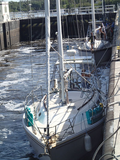 As I closed in on the Lock, I noticed two other sailboats behind me. I didn’t particularly like the idea of going through the Lock with any other boats, but felt somewhat reassured that I would be going in first (and only have the potential to crash into the sides of the Lock or the gate, but not another boat). I was anxious docking the boat against the giant concrete wall, but it went well. I glided right up, the Lock manager threw me a stern line, I cleated it off, ran forward and caught the bowline before Blue Wing veered too much out towards the center. Greg had driven ahead and was waiting when I arrived. I was hoping that he could help me hold one of the ropes, but this wasn’t allowed. The Lock manager said that I would have to go back and forth. After everyone was tied up, the gate opened and the water rushed in. Blue Wing slowly rose against the wall as the Lock filled. I pulled the stern line towards me over the stern pulpit, uncleated it, pulled it taut, cleated it again and went forward to do the same with the bowline. Easy! It was no big deal at all! Afterwards the Lock Manager complimented me on my rope handling!