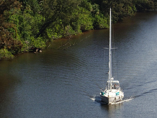 After dropping Greg off at the dock I motored away from the marina towards the red and green day-markers that delineate the edge of the Okeechobee Waterway. The river is wide here and shallow outside of the marked channel, so it is very important to stay between the reds and greens. I was doing great, heading towards my first fixed bridge when the depth sounder started reading 2 feet, 1.5 feet, 1.2 feet. “Sh*t!†(Contrary to what Robert Redford and “All is Lost†may have led you to believe, sailors do talk to themselves, even in such perilously banal situations such as going aground.) I could see a green channel marker way in the distance, but it obviously wasn’t the correct one to head for. Ugh! Spotting markers is usually Greg’s job. I did a visual scan of the water. Couldn’t see it. I was only just little over a mile away from the marina and hoping this journey wouldn’t end so early and dismally. Then I saw something up on the road, no it just looked like it was on the road, it was actually in the water – a green square, my next marker. I steered back into the channel.