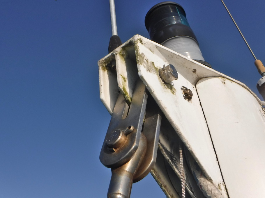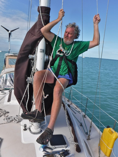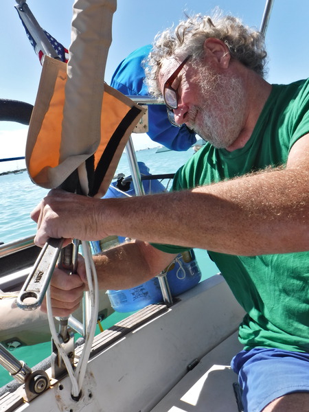 Thank goodness for FaceBook’s Women Who Sail group. Women can pose questions there without fear of being belittled for their ignorance. Duwan started asking questions and relayed the answers to me. (As a guy, I’m not allowed to look.) We got several good suggestions, one on how I could climb a halyard myself.