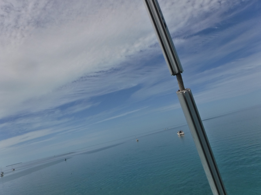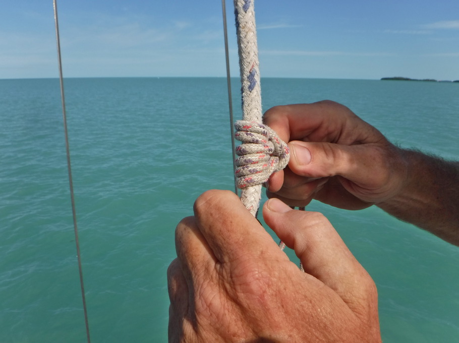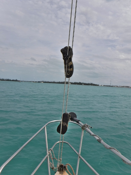 I paused (again) to catch my breath, and looked around. I was past the spreaders, almost to the top of the mast. The view up here is nice. On a calm day like this you can see the fort at Key West, the cruise ships docked near Mallory Square, the Frankfort Bank, and the bay on the other side of Fleming Key. Why am I up here? To re-attach the forestay we dropped in our last blog post