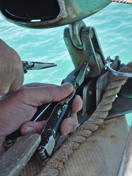 Next, I hauled up the forestay while Duwan used a boat hook to try and keep it out of the wind generator and shrouds. I tied off the end of the forestay and carefully pulled out the replacement pin and tools. Don’t want to drop anything at this point.