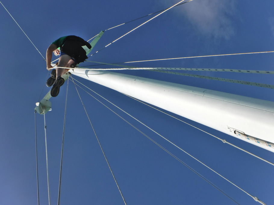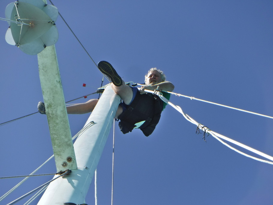 Moving about 12 inches each step, it took me a while to get to the top of the mast. This is an activity for younger, lighter, stronger people. But I finally made it.
