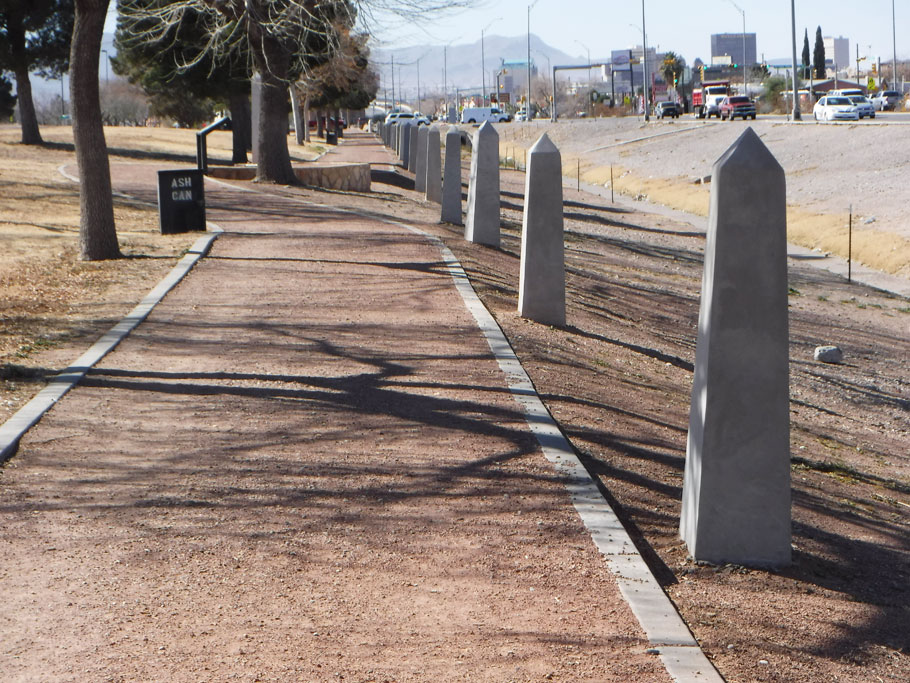 On the recommendation of a park ranger at Big Bend, we stopped in El Paso at the Chamizal National Memorial, where these obelisks mark the old border. In 1864 the Rio Grande shifted here, leaving a large chunk of disputed land, whose population was in limbo. Almost century later, the Kennedy administration brokered a deal with Mexico. The river would be diverted through the center of the land.