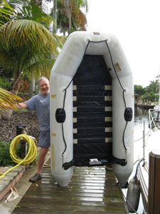 Our engine ran fine when the former owner started it during the survey, but I have been unable to crank it since. After checking everything I know about, I called for help. The guys from KC Marine came out and did some more testing before noticing that the glow plug wasn’t hot. After we gave the plug enough time to heat, she started right up. Then, after a quick break to trim my nails, we pumped up the dinghy. No leaks!