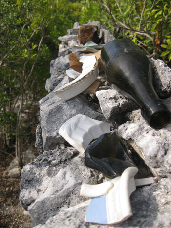 From the beach, as you head up to the trail before you reach the sign directing you to the Russell Ruins, there is a trail to the left. This trail most likely leads to the beach, but we didn’t follow it that far. I decided to turn around shortly after we saw the snake. We did follow it far enough to encounter another crumbling building. Stacked up on top of one wall of the house were artifacts, bottles, and decoratively painted pieces of pottery.