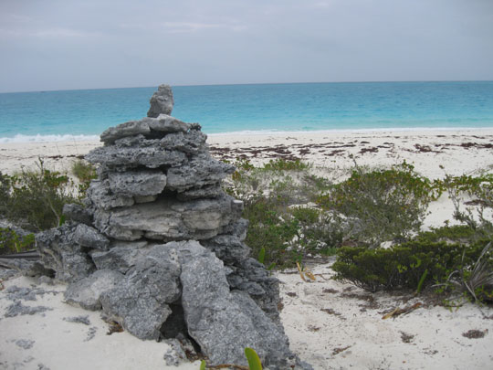 The tide was ebbing as we visited the pond. The water was shallow and many fields of spongy quick sand covered by a dark fungus spread out ready to devour our feet as we attempted to cross them. We walked on cracked flat stones and black coral like rocks, mangroves grew in the soggy earth, and low lying plants and bushes grew out of the rocks, sand and dirt. But what fascinated me most about this expansive swamp was the cairns.