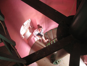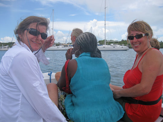 We had lunch a cute dockside restaurant overlooking the harbor with a very nice view of the cute lighthouse. We were still pondering how to get to it when the waitress arrived with the bill. Greg asked her the best way to get across the harbor to the landmark. She looked out over the water and said, “Anthony will take you,†as she flagged down a skiff, conveniently coming our way. Debbie and Karen quickly paid the bill and we all piled into Anthony’s boat.