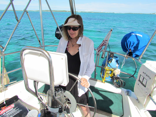 Our destination was an anchorage off the amazingly beautiful, but unfortunately private Matt Lowes Cay. Karen tried her hand at the helm this time and we had a very nice short late afternoon sail. As soon as we dropped the hook, Debbie went straight into the water.