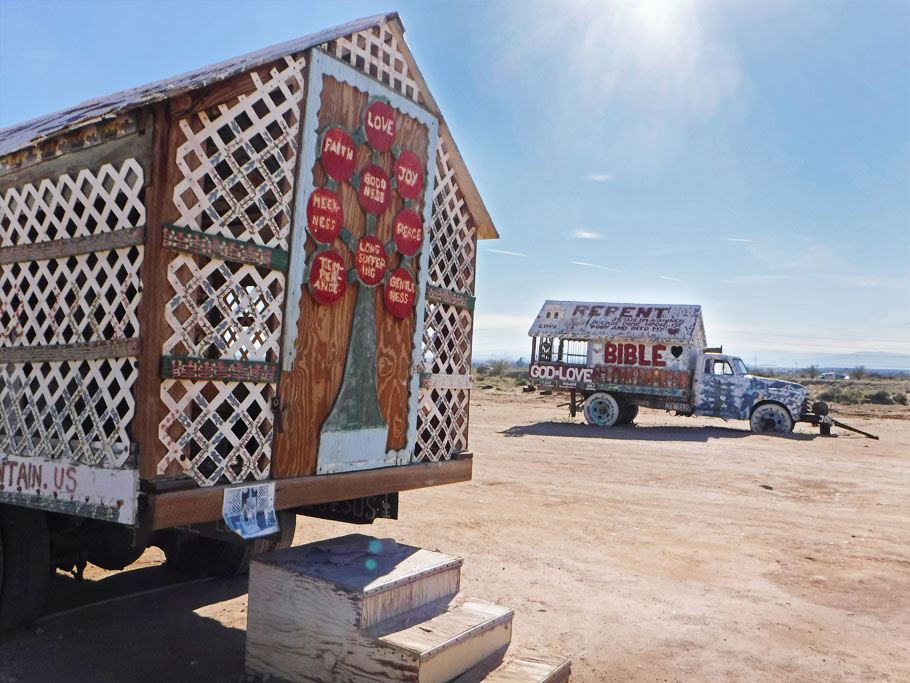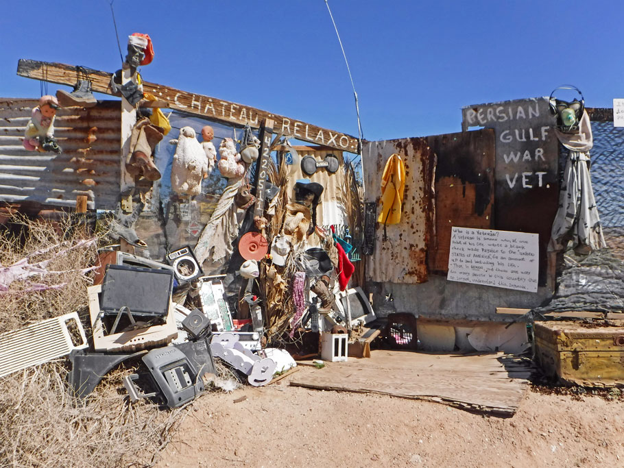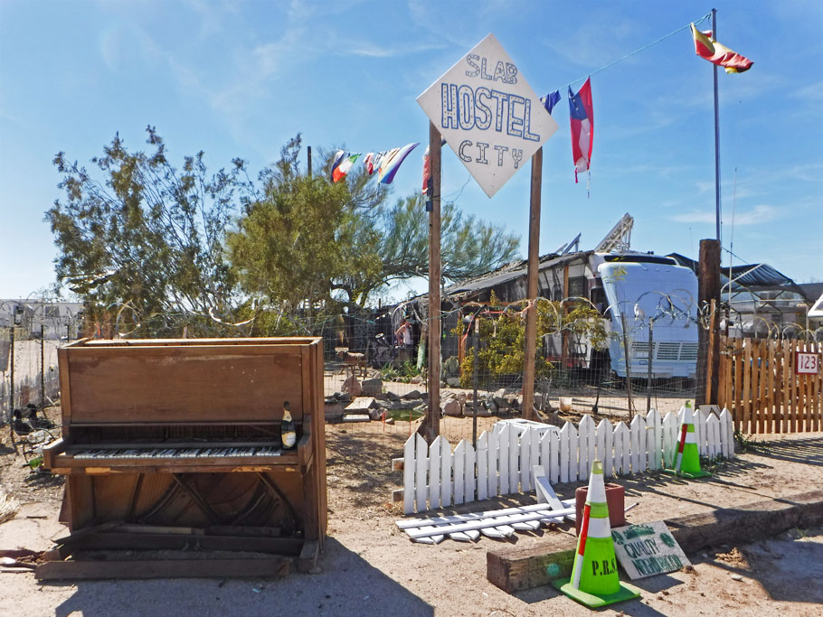 It’s just like any other town, but without the money. There are neighborhoods, bars, art exhibits, and a library. But there are no water mains, sewers, trash service, or power lines: or local law enforcement. Welcome to the wild west. Welcome to Slab City.