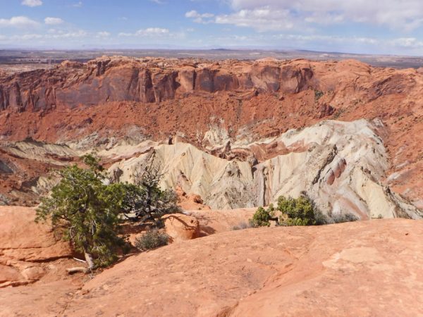 Our drive took us east around the park, through Moab (where we spent some time last year), to the NE entrance of the park. We drove back toward the park’s center, and here we are at the Island in the Sky. Remember yesterday’s shot that showed it 10 miles away as the crow flies? We drove over 100 miles to get here.