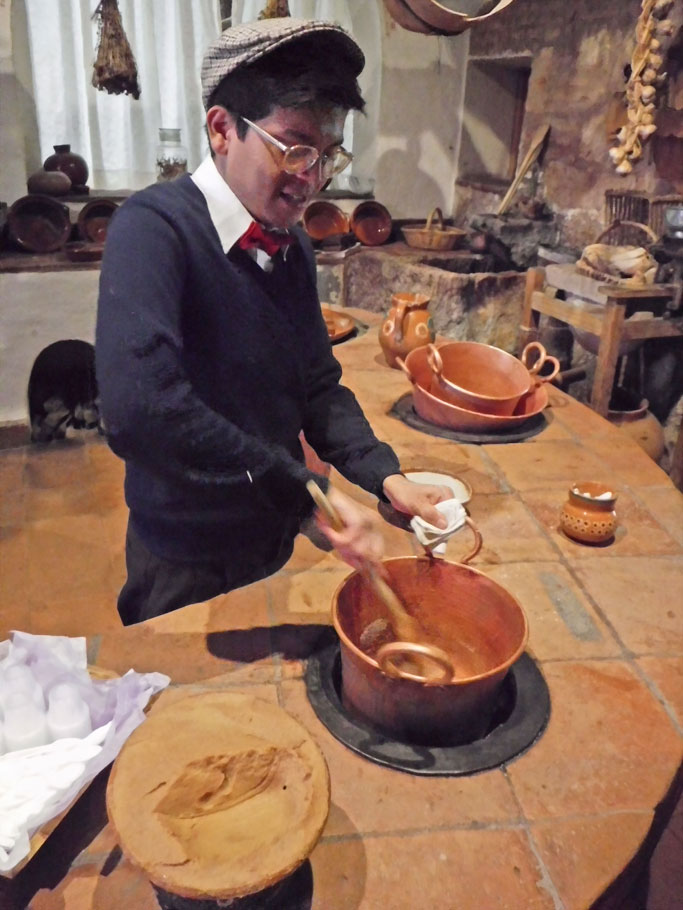 Our guide at the sweets museum demos the candy-making process. First, some quince pulp is scooped from the pot at the bottom. An equal amount of sugar is mixed in. And the mixture is stirred over a stove fire. Tastes great! Gets darker and better the longer it’s cooked. The mixture is put into molds to cool.
