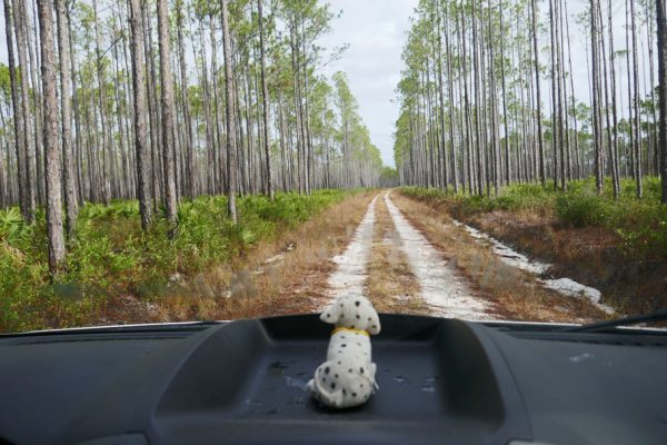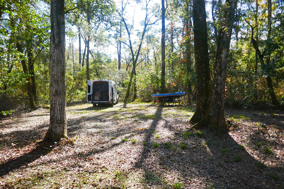 We thought Cotton Landing was going to be our last night in the forest but then we got booted out of an urban boondocking location in the city of Apalachicola by the police (possibly another story for another day). It was dark and the easiest thing to do was to return to the closest site we were familiar with which was the road that led nowhere – Forest Road 124. I had seen spots along 124 I thought would do when we had driven down it the day before. It wasn’t perfectly legal since it was open gun season so we just hoped there weren’t any crazy hunters traipsing around the forest in the middle of the night who would mistake Ballena Blanca for a big white deer.
