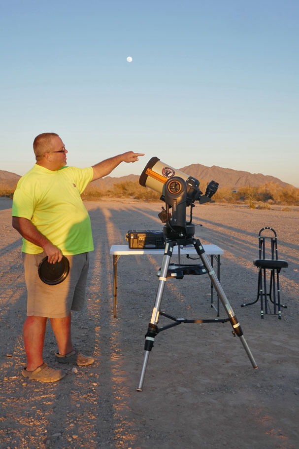 John checks out the drive for the scope. After dark, all the scopes will be oriented by pointing them to two known stars. After that remote controls can steer to any spot in the night sky. The eyepiece for this scope is sticking out of the upper cylinder pointing toward John’s right shoulder. He has a large selection of eyepieces. Depending on what the scope is pointed at you may have to stand on the 8′ ladder (behind scope in this pic) to look through the eyepiece.