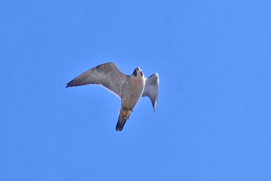 Peregrine Falcon. When freed, this one took off for a while way up in the sky. They can dive in at 60mph. Very impressive when it decided to come back for its treats.