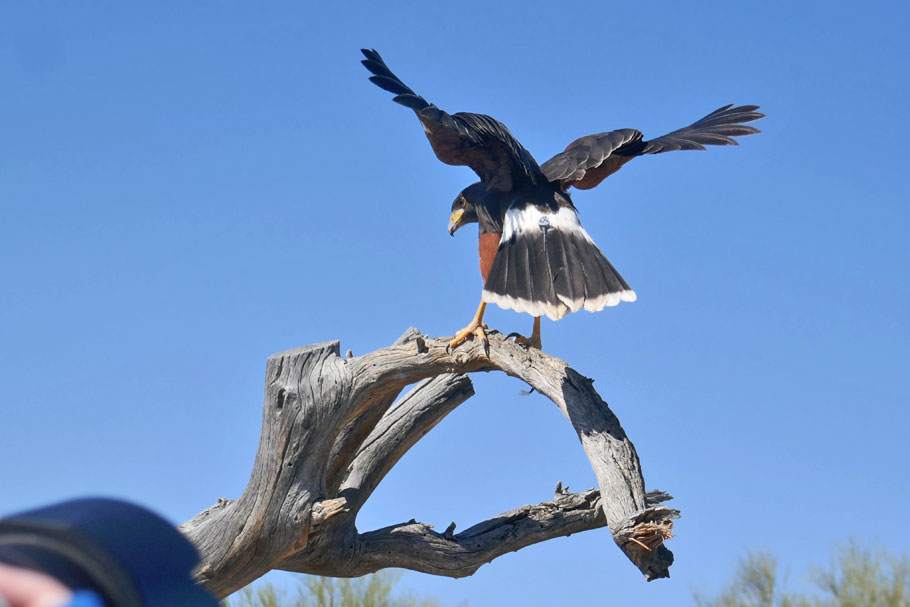Harris Hawk leans in to practice mantling. When hawks feed they bend over to hide their food from others.