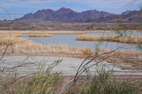 The Cibola National Wildlife Refuge is located by the Colorado River. Levees have been erected to hold the river between its banks, stopping the seasonal flow into river wetlands like this. At Cibola water is artificially diverted from the river into this wetland lake.