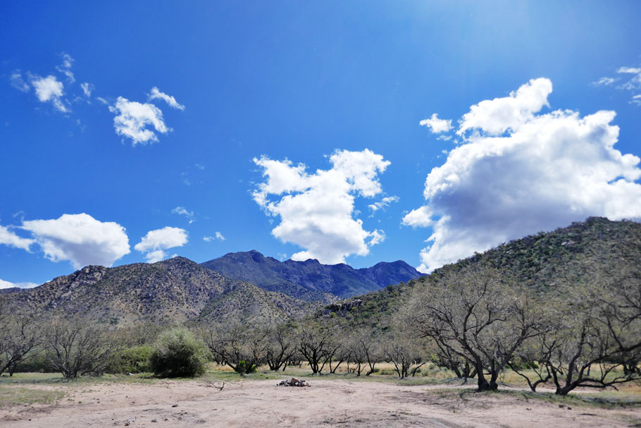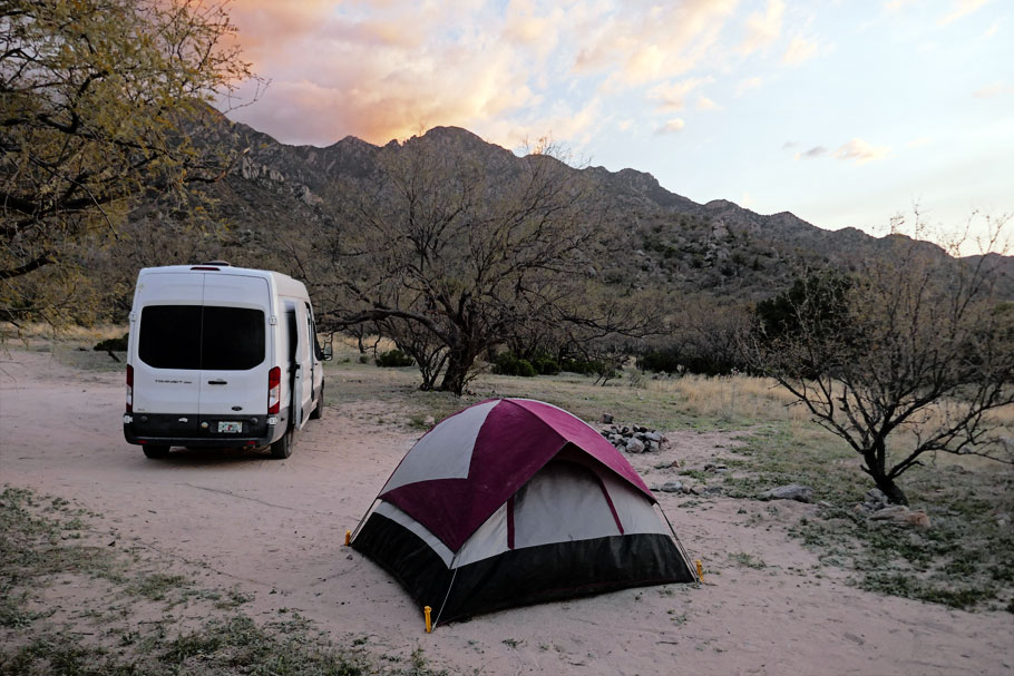 Madera Canyon is just a slow hour’s drive on unpaved roads west over a mountain from Las Cienegas. I knew from my iOverlander app that in addition to the campground there were 10 numbered dispersed campsites on Proctor Road at the canyon. Ten is not very many and I was a tad worried about finding a spot but I figured we could always return to Las Cienegas. We turned down Proctor Road, site 1 – taken, site 2 – taken, site 3 – taken. A few of the sites looked big enough to fit at least two rigs comfortably, perhaps, we thought, we can share if we can’t find anything. We passed 4, 5, 6, 7, 8 – taken. Finally, we passed site 9 – taken. Then rounding a corner we found the last number. Site 10 sat right on the road. It wasn’t ideal but it also wasn’t taken. While Greg was getting the van level I walked around the small camping area. Wedged in between two stones in the fire pit was a note. I didn’t pick it up but could read the words “Will be right back.” If someone really wanted to save the spot they would have left something more substantial than a note, I thought. I chose to ignore it. Greg eventually saw the note too but we decided that “right back” had passed in the amount of time it took us to get settled. No one ever showed.