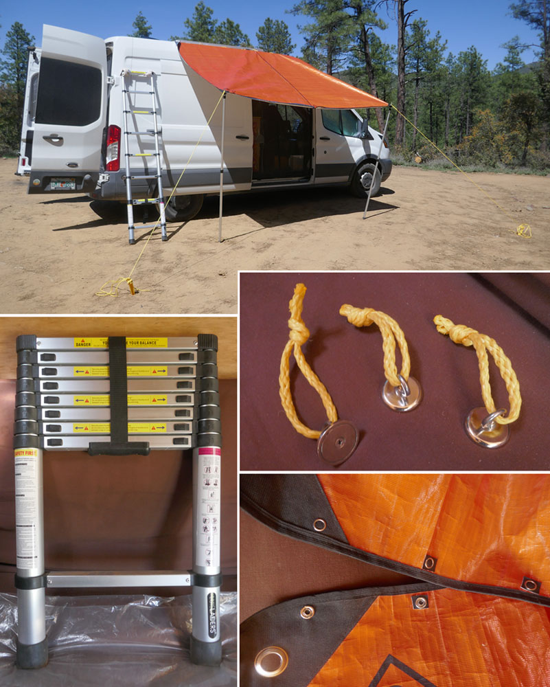 Our new awning set up that I mentioned in last month’s expense report. We took two tarps that we already had and added snaps to them so they could be connected together. We bought extra-strong magnets to hold the tarps on top of the van. We also had to buy a ladder to get to the top of the van. The ladder collapses and is stored behind our refrigerator inside the van. We also bought two awning poles and some rope to hold it all in place. It works well in gentle breezes but strong winds will detach the magnets. It is still a work in progress.