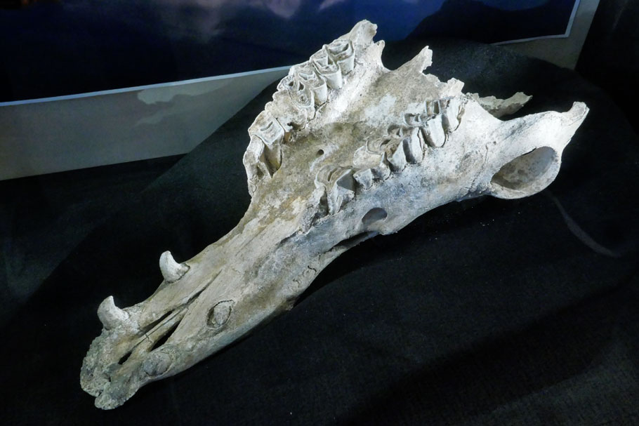 Wow! Good catch. In fact this is a female horse skeleton that mistakenly got put together with a lower male jaw – that’s why it looks wrong.