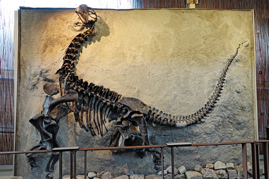 Here is a juvenile Camarasaurus with its complete skeleton still mostly embedded in sandstone. Adults grew to 75 feet, weighing up to 51 tons.