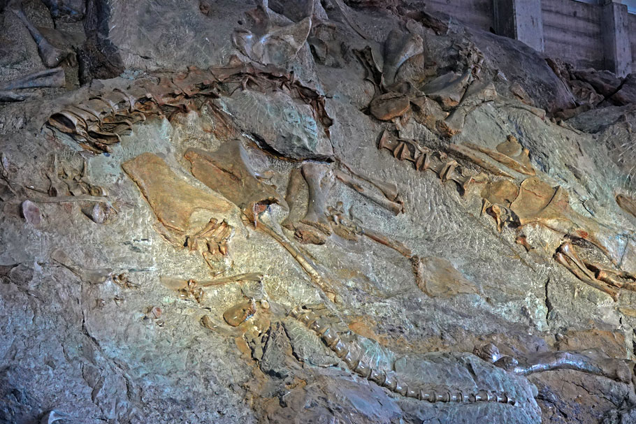 After partially excavating the bed, Earl Douglass envisioned a covered display where people could come view, and even touch, a wall of Jurassic fossils. The Quarry Exhibit Hall was built. It was closed for a short time when the foundation started to settle but has been re-opened. Printed guides and interactive displays help you identify what you are viewing. You can also view online videos made by park rangers climbing the wall to point out interesting finds.