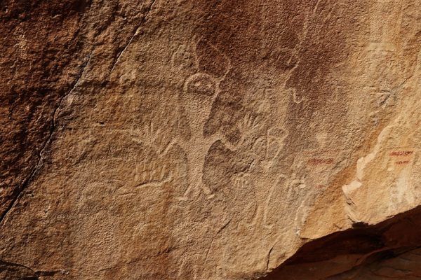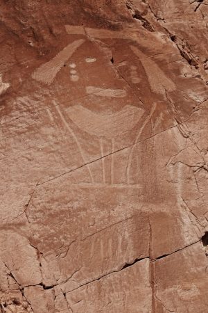 Petroglyph of Big Hand Wick Head and his minions at Club Creek.