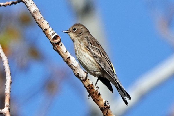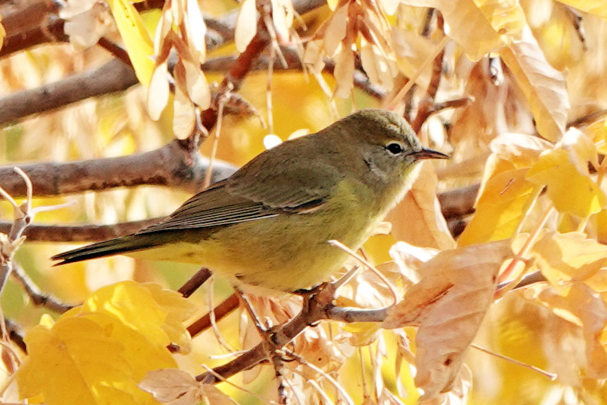 Orange-crowned Warbler. What if birds, like dinosaurs, were extinct and all we had to go on were fossilized bones? We’d have no way of knowing about the varieties of color and behavioral adaptations. Maybe dinos were colorful and had odd behaviors too. We’ll probably never know.