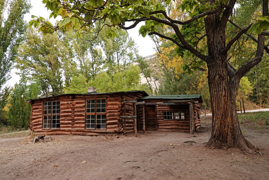 Cabin built in 1913 by Josie Bassett Morris. Josie was married five times and divorced four. During Prohibition visitors came for her home-brewed apricot brandy and chokecherry wine. In her 60s she was tried and acquitted twice for cattle rustling. She lived here without plumbing or electricity for 50 years.