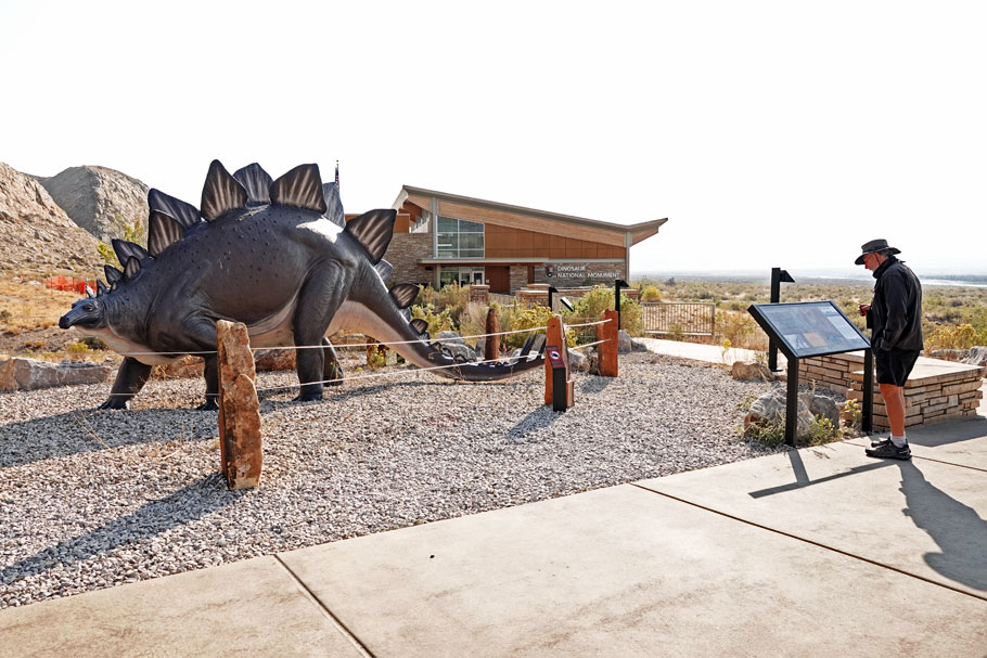 In the background stands one of the of the two Dinosaur Visitor Centers. Greg reads a plaque about our Stegosaurus friend to the left. He was one of nine life-sized dinosaurs sculpted by Louis Paul Jonas of the Sinclair Dinoland exhibit at the 1964-65 New York’s World’s Fair. After the end of the fair, the dinos toured the country on a flatbed truck for several years before finding new homes. The Fair’s Stegosaurus ended up here at Dinosaur where it has greeted visitors ever since.