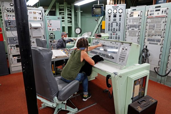 The second call is at the entrance to the control center. Another button pushed from inside will let you in. Halfway down the 55 stairs, outside the first three-ton, nuke-proof door, you make the third call. Now you have a sequence of buttons to press, coordinating with someone inside. Then again at the second nuke-proof door, and at the bottom of the stairs.