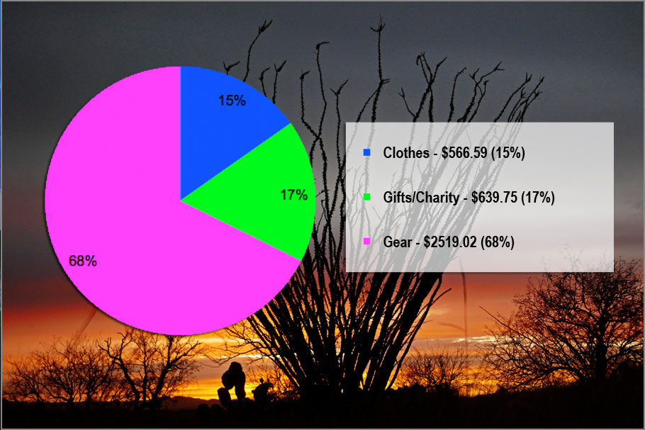 We got a little spendy in the personal category this year. New boots for both of us, some souvenir t-shirts, a couple of new hats, a new pair of gloves, and some everyday clothes from the thrift store in the Clothes category. Gifts/Charity includes buying Christmas gifts for family for the first time in many years, periodically sent gifts to Greg’s grandson, and gave a little to a GoFundMe. We spent some big money on new Gear – a new camera and a new tablet were the biggest ticket items.