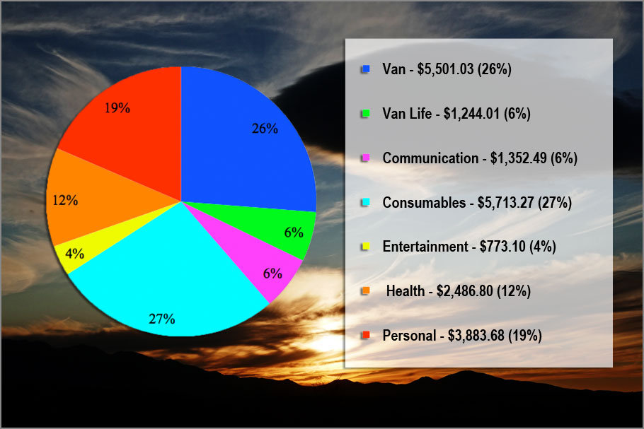 Ha, you spent a dollar a day for camping. Like us, your main categories are the van and consumables. I think that’s quite normal. Except for people who constantly stay in campgrounds. I have a feeling that the camping category would beat all others if that were the case.