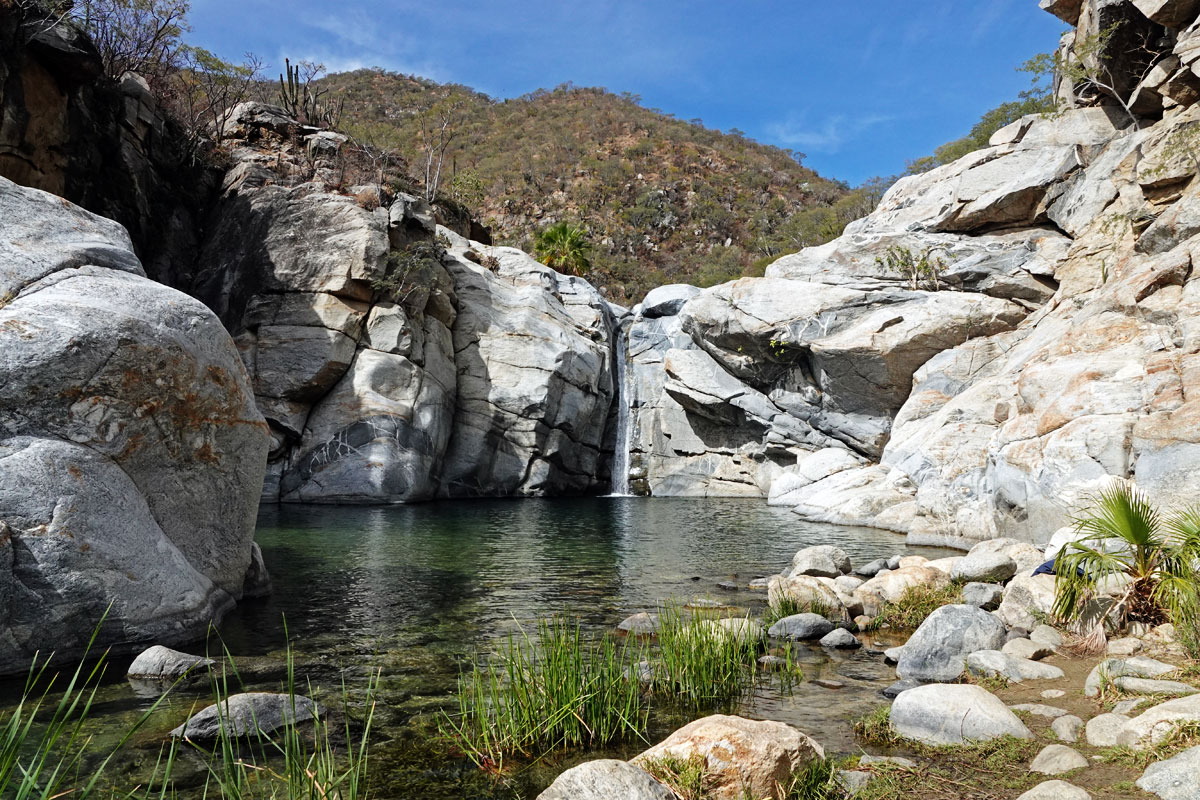 The sea/ocean isn’t the only water in Baja. While in Cabo Pulmo, Greg and I decided that we wanted to do a trip inland in El Burro to visit a waterfall at Rancho Ecologico Sol De Mayo outside of the town of Santiago. We invited our friends Mark, Liesbet, and Maya to join us. There was much discussion about other features in the area including hot springs and a stunning canyon hike where friends of Mark and Liesbet’s ran into rough-looking men on horses with guns they assumed were cartel, as well as the price to visit the falls, 150 pesos (around $7.50 – which seemed steep) per person. We finally settled on just visiting the waterfall and the hot springs if we had time. Mark decided to stay in Cabo Pulmo with Maya since dogs were not allowed at the waterfall.
