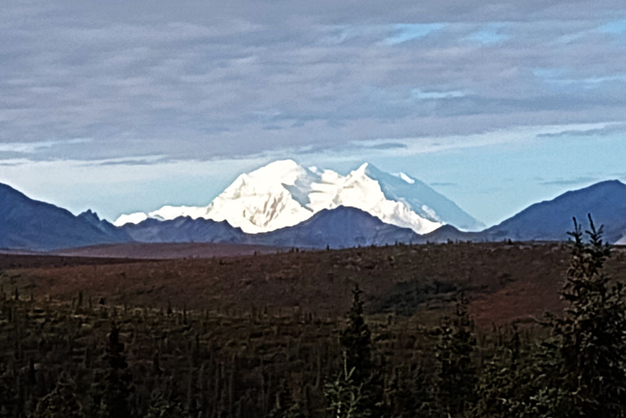Alaska is home to many mountains. We’ve already posted about the Kenai and Chugach mountains, and the Wrangell and Saint Elias chains. Our next stop was the Alaska range, which forms a 600-mile-long arch north of all these. The tallest Peak in this range, and in all of North America, is Denali. This peak and 7,400 square miles of land around it are protected by the Denali National Park and Preserve.