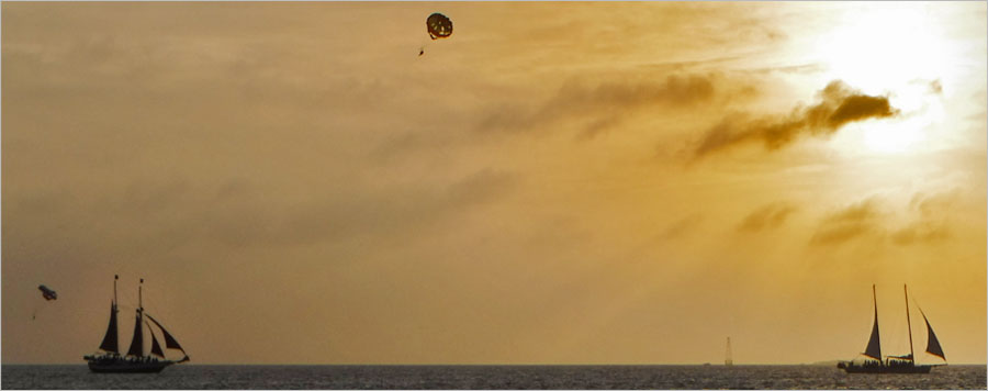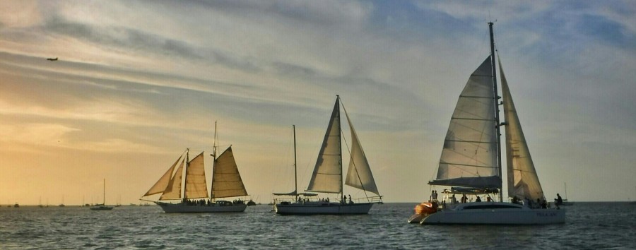Dec. 31 – Jan. 2. Multisailed boats parade by Blue Wing packed with tourists soaking up the sea air as the sun sinks in the sky over Key West. The late afternoon light turns the sails of these big boats…
