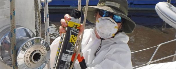 October 31 – December 29, 2018. Stop! Stop! Greg was down below winching me up the mast. I was about halfway to the top when I looked up and saw them. Hornets swarmed around the spreaders a few feet away…